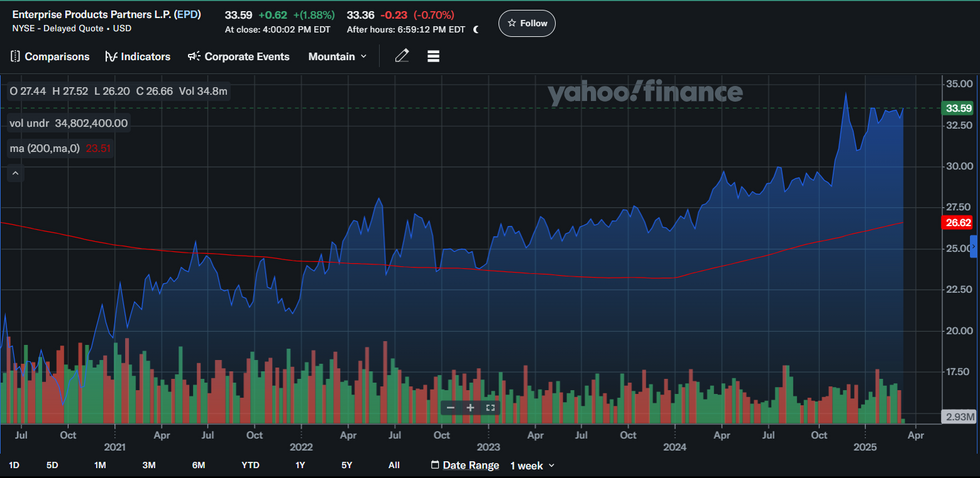 EPD, founded in 1998 by Dan L. Duncan and headquartered in Houston, Texas, trades on the NYSE under the ticker EPD. It operates through four segments: NGL Pipelines & Services, Crude Oil Pipelines & Services, Natural Gas Pipelines & Services, and Petrochemical & Refined Products Services. Recent financial highlights include a record net income of $5.9 billion for 2024, with an EPS of $2.69, and a market capitalization of approximately $67.5 billion. The stock’s 52-week range is $26.23 to $34.43, with a current price around $31.14 to $33.45, and an average trading volume of 3.96 million shares daily over the past three months.